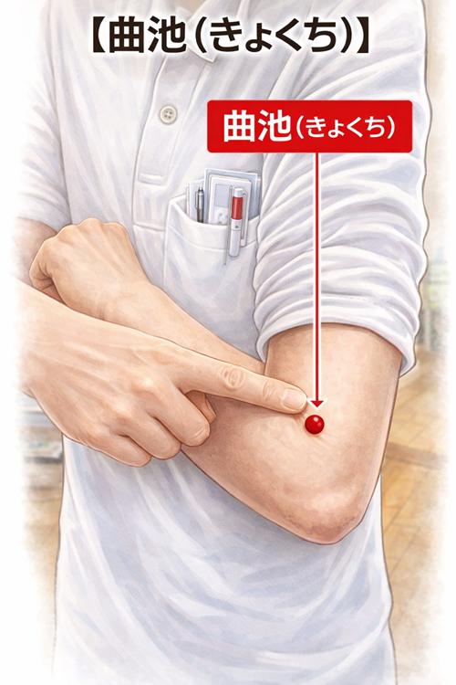 ■ 期待される作用・体・肩こりや腕の張り・目の疲れや頭の重さ・のどの違和感・肌荒れやかゆみなどの皮膚トラブル体の巡りを整えることで、季節の変わり目に起こりやすい不調の緩和が期待されます。■ 曲池の場所とセルフケア方法肘を曲げたときにできるしわの外側の端に位置します。反対の手の親指で、ゆっくり息を吐きながら3〜5秒ほど、気持ちよい強さで押してみましょう。強く押しすぎず、心地よいと感じる程度で行うのがポイントです。これを数回繰り返します。お風呂上がりなど体が温まっているときに行うと、より取り入れやすくなります。